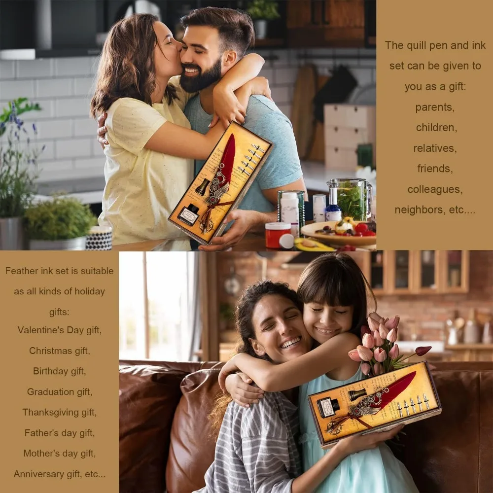 Product content: 1 quill pen, 5 replacement tips, 15ml ink, brass base.